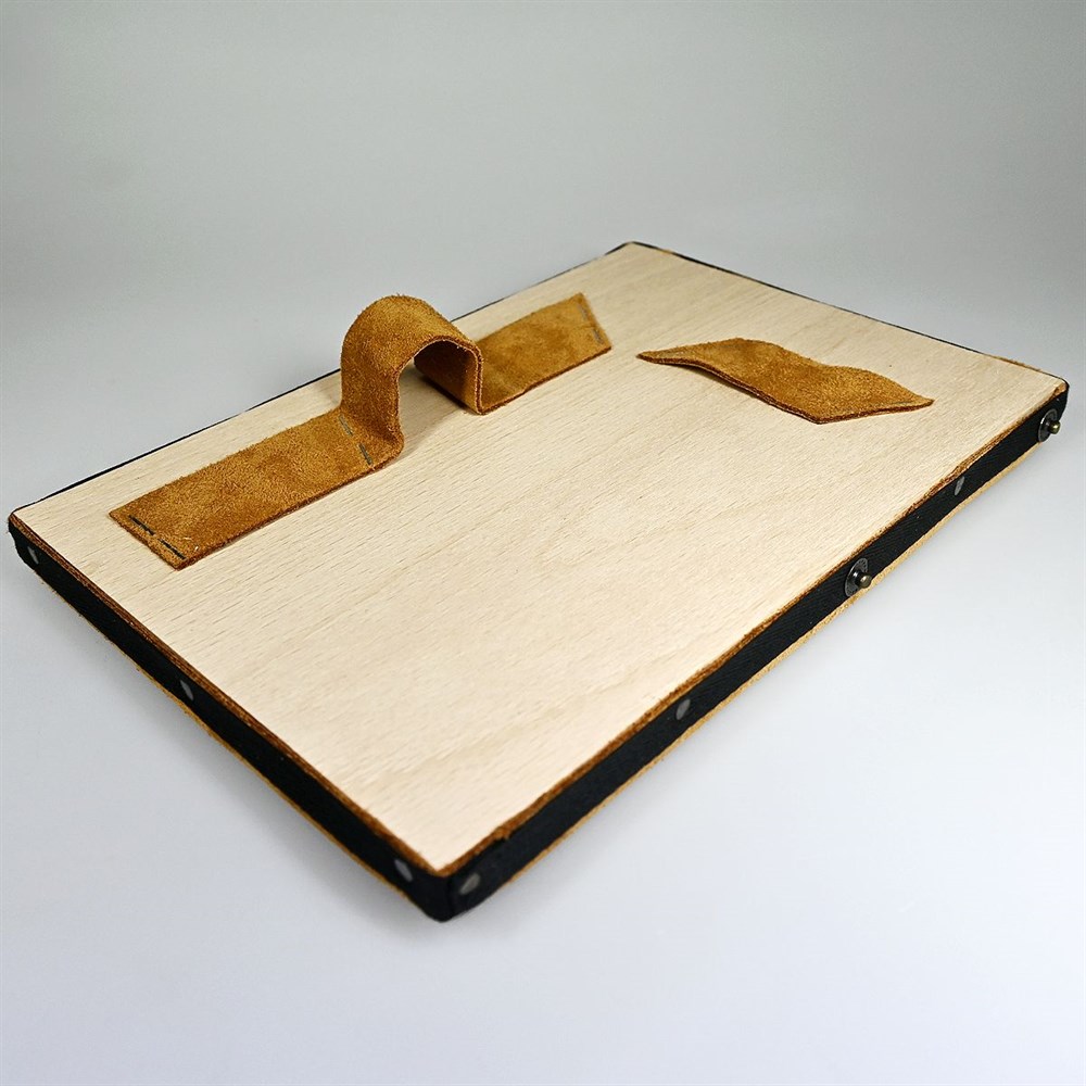 Mykt forgyllingsbrett med avtagbar vindskjerm i fleksibel plastikk. Trukket i mykt kalveskinn, med knivholder og tommetstropp på undersiden.