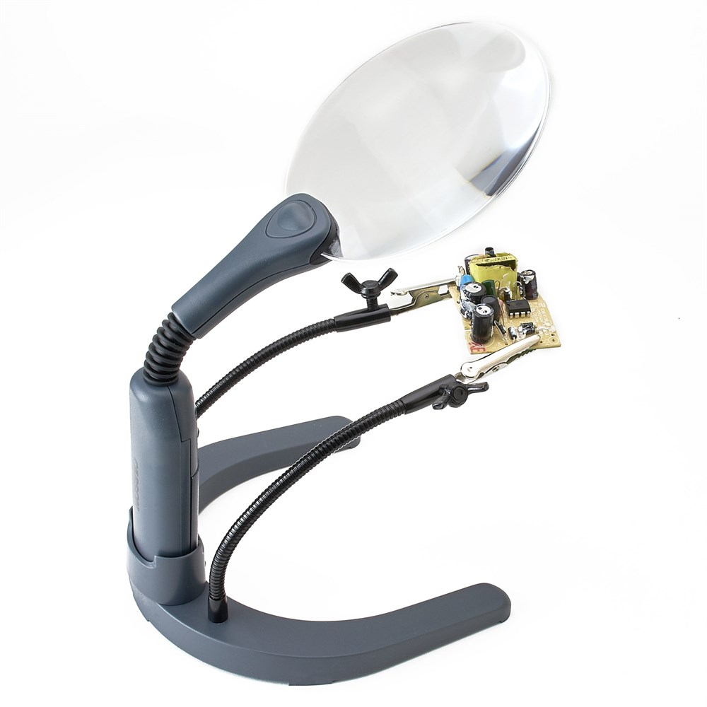 HelpingHands Magnifier™ har en kantfri design slik at sikten din ikke hindres. Ideell for hobbyer, modellbygging og liten elektronikk. Selve forstørrelsesglasset kan også tas av og brukes løst.