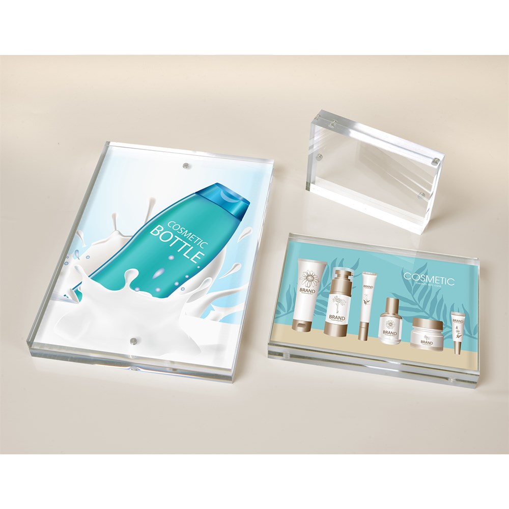 Stilig og sterk holder i klar akryl. Perfekt for ulike utstillinger i butikker eller som en enkel stilig fotoholder på et bord eller en bokhylle. To små sterke magneter holder blokkene sikkert sammen. Stilig og veldig enkel å bruke. Produktet er ikke designet for å henge på vegg.